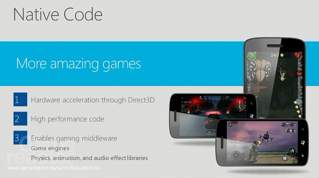 Erityisesti pelinkehittäjiä hyödyttää tuki rautatason ohjelmoinnille, koska se mahdollistaa teknisesti kehittyneempien pelien luomisen. Tämä helpottaa myös olemassa olevien pelien kääntämistä iPhonelta tai Androidilta. Havok-fysiikkamoottori ja N.O.V.A. 3 vahvistettiin jo Windows Phone 8:lle.