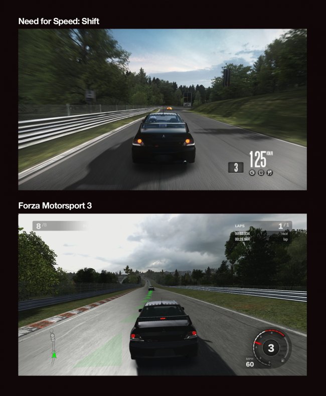 Tasapuolisuuden nimissä molempien kuvat on otettu Xbox 360:lla eikä niitä ole käsitelty jälkeenpäin. Yksi huomionarvoinen ero jää silti pysäytyskuvissa piiloon: Forzan ripeämpi kuvanpäivitysnopeus. Peli piirtää 60 kuvaa siinä ajassa, kun Shift pääsee 30:een. Shift pyrkii paikkaamaan puutteen liikesumennusta käyttäen. Tehoste erottuu parissa kuvassa selvästi.