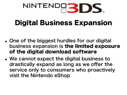 "Näemme digitaalinen jakelun kasvavan huomattavasti, joten on ensiarvoisen tärkeää laajentaa näkyvyyttä ladattavista peleistä kiinnostuneiden asiakkaiden silmissä", selittää Satoru Iwata vuosikatsauksessa.